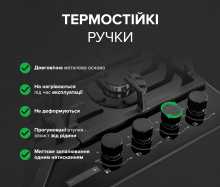 | Програми і функції | Автоматичне електрозапалювання вмонтоване в ручку. Максимум зручності одним рухом. Поверніть ручку і конфорка миттєво загориться без зайвих зусиль чи затримок. Ніяких кнопок лише простота та швидкість. Газ-контроль кожної конфорки - Засіб безпеки, що спрацьовує коли вогонь згас від потоку повітря чи від рідини. Автоматично вимикається подача газу на пальник. 6 рівні потужності для газових конфорок. Регулювання забезпечує точний контроль полум’я для різних типів приготування. Від ніжного томління на мінімальному вогні до швидкого обсмажування на максимальному — ви легко підберете оптимальний режим. Timer Control ТАЙМЕР від 1-180 хв для комфорки ТУРБО ідеальне рішення для безпечного та зручного приготування страв. |