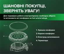 | Діаметр і потужність конфорок | Електропостачання: 230 В, 50-60 Гц, 2 Вт Загальна споживча потужність: 8,5 кВт Типи газових пальників: Газовий пальник високої потужності(конфорка ТУРБО, передня ліва) – 4000 Вт; 2× Газовий пальник середньої потужності (задні) - 1750 Вт; Газовий пальник малої потужності (допоміжний, передня права) – 1000 Вт |