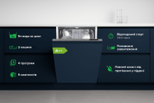 | Програми і функції | 4 програми миття: - Інтенсивна мийка 65ºС; - ECO мийка 45ºС; - 90 хв (звичайна щоденна) 60ºС - Швидка мийка 50ºС; Половинне завантеження Відкладений старт 3/6/9 годин Індикатор наявності солі Індикатор наявності ополіскувача Завантаження - 9 комплектів посуду Використання води - 9 л |