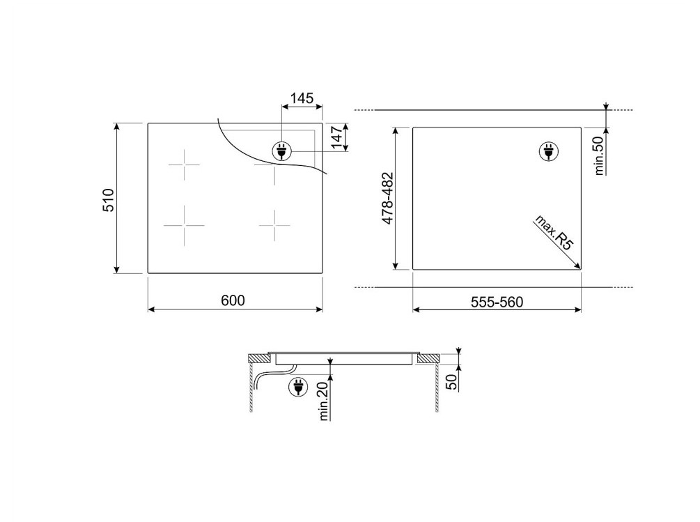 | Діаметр і потужність конфорок | 4 індукційні конфорки: Задня ліва: 1,85 кВт (Booster - 2,1 кВт), ø 160 мм Передня ліва: 2,3 кВт (Booster - 3,0 кВт), ø 210 мм Задня права: 2,3 кВт (Booster - 3,0 кВт), ø 210 мм Передня права: 1,85 кВт (Booster - 2,1 кВт), ø 160 мм |